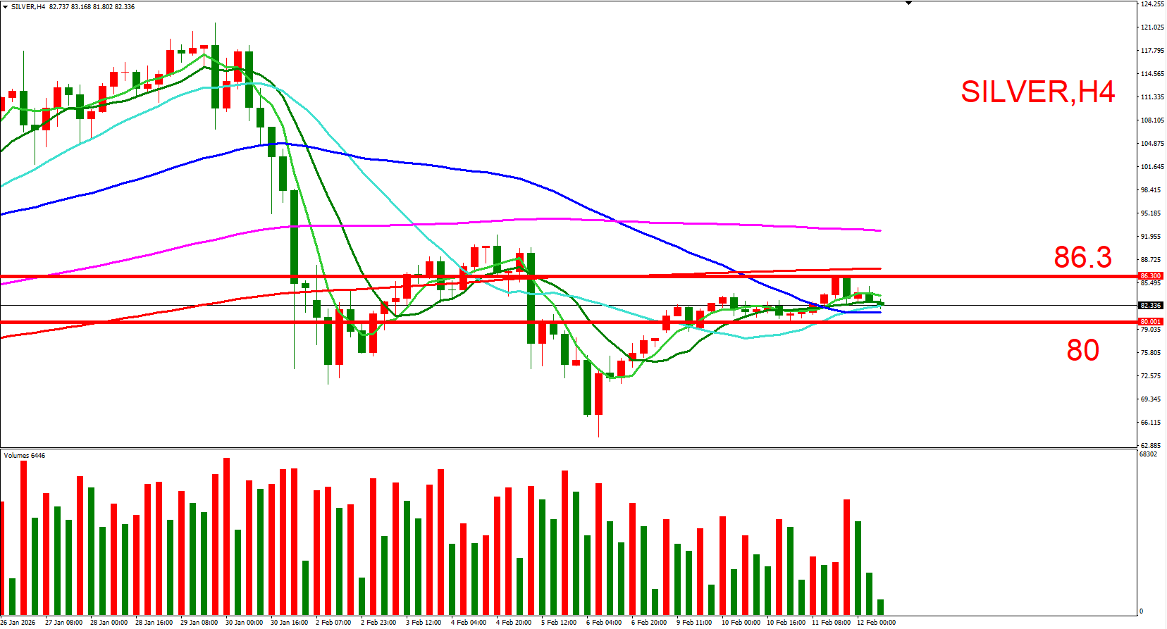 白银跟随黄金同步,短线偏空看待。可参考(86.3,2/11大量高位)与(80,整数大关),来作为压力与支撑位参考,用以判断低接或突破进场机会。