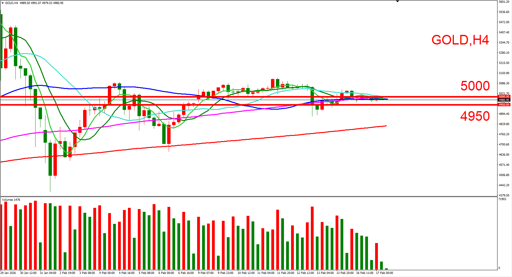 短线可以(5000,近一周横盘高位)与(4950,近一周横盘低位) 来作为压力与支撑位参考,用以判断低接或突破进场机会。