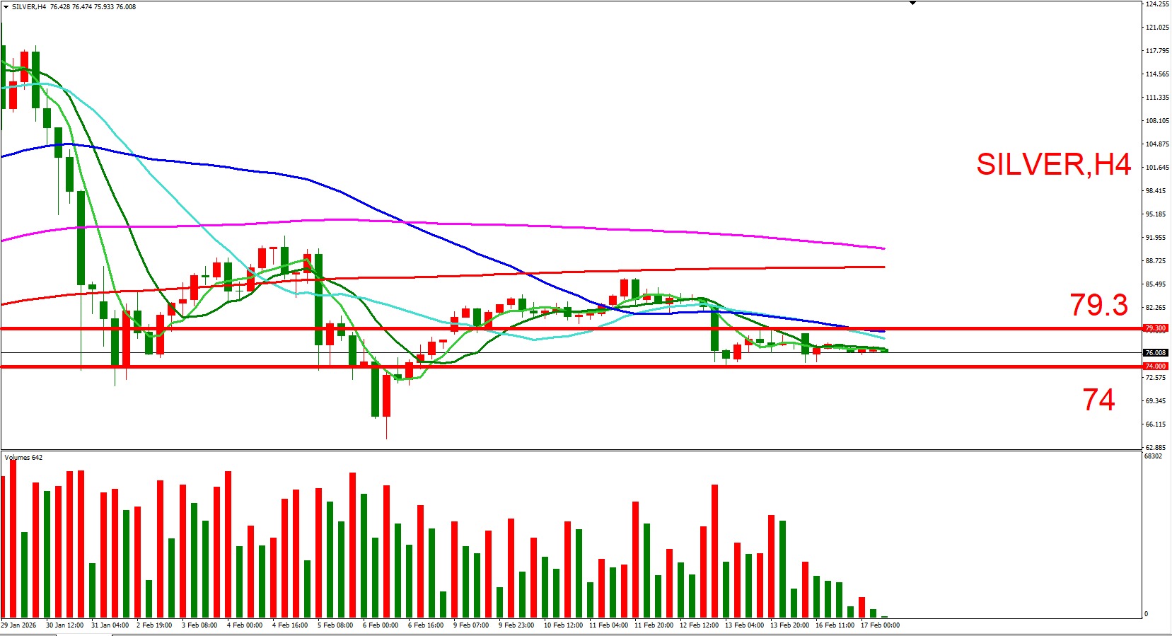 白银跟随黄金同步,短线偏多看待。可参考(79.3,近一周横盘高位)与(74,近一周横盘低位),来作为压力与支撑位参考,用以判断低接或突破进场机会。