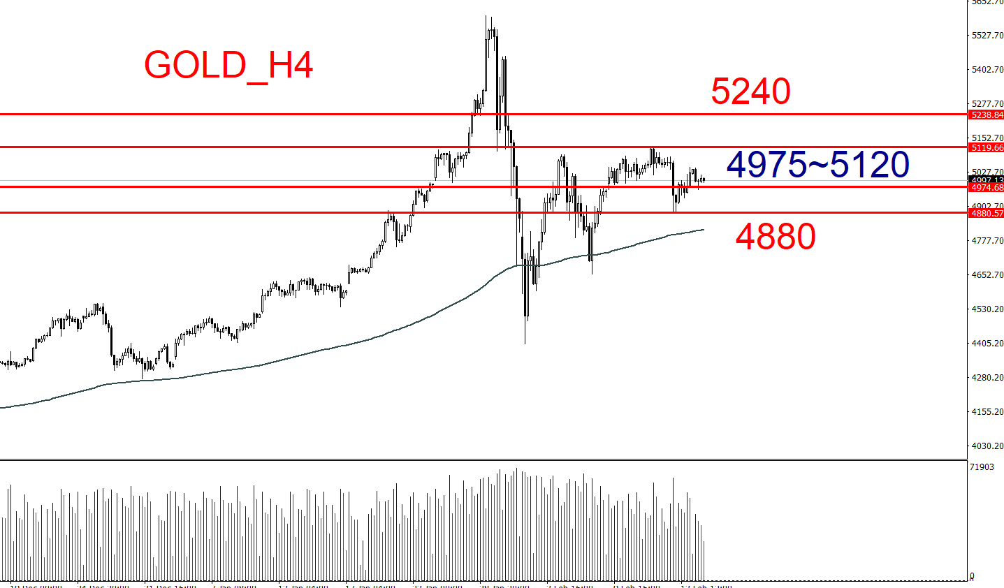 价格触及 4975并反弹可尝试多单,目标看向区间上沿(5120)。