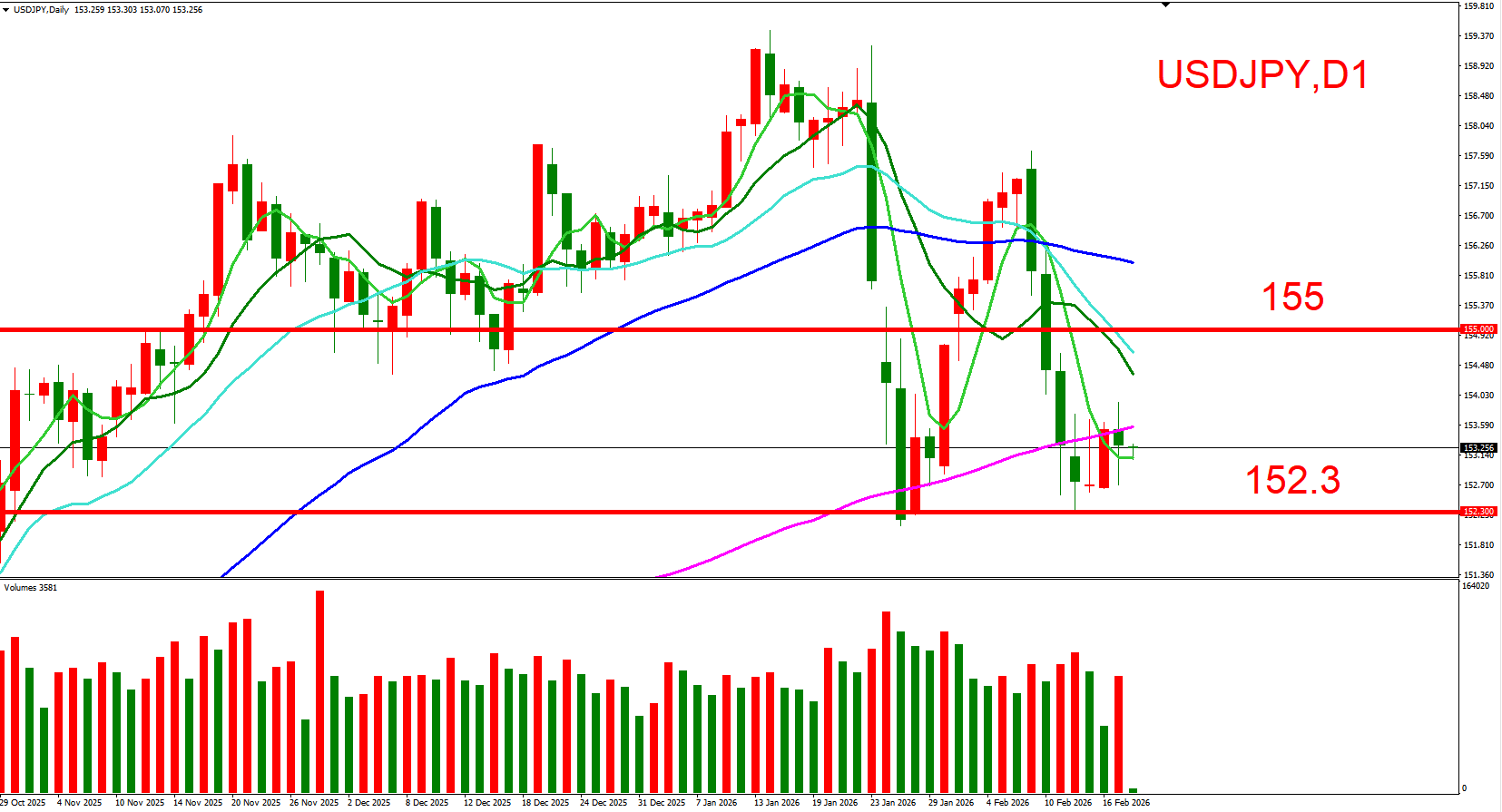 短线上可以(155,整数大关)与(152.3,2/12下影线大量低位)作为压力与支撑位来做参考。