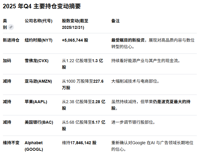 13F报告显示,伯克希尔·哈撒韦公司在去年四季度进一步减持了苹果公司的股份,市场密切关注巴菲特卸任CEO前最后一个季度的操作。文件显示,截至去年第四季度末,伯克希尔整体持仓规模为2740亿美元,较前一季度的2670亿美元有所增加,前十大重仓股集中度为88.26%。据数据平台Whalewisdom统计,与去年第三季度末相比,伯克希尔Q4增持了4个标的,减持9个标的,新进1个标的。家总部位于奥马哈的集团披露,其将苹果的持仓缩减了4.3%,至619.6亿美元。即便有所减持,苹果仍是伯克希尔迄今为止的最大持仓。美国银行也遭到进一步减持。