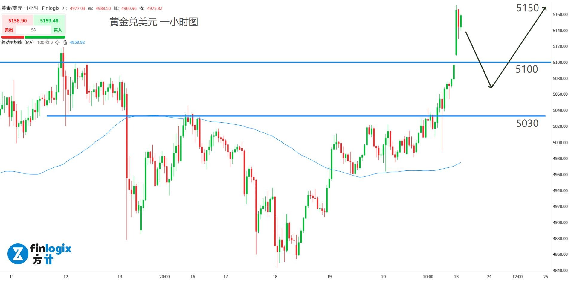 技术面:100均线微微向上,多头动能开始释放,不过考虑到美股回调可能引发白银震荡。黄金的价格可能会出现冲高回落的走势。交易策略以回踩关键支撑看涨为主。关注突破位5100和颈线5030之间的支撑效果。