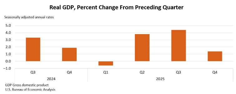 根据美国****周五公布的初步预估数据,继上一季度增长4.4%之后,第四季度经通胀调整后的国内生产总值(GDP)年率增长1.4%。美国商务部经济分析局(BEA)的数据显示,2025年全年经济整体增长了2.2%。该数据发布后,美国总统特朗抨击因民主党导致****停摆一个月多,并使美国GDP成长损失了至少两个百分点。不过除了受到****停摆影响之外,美国12月贸易逆差规模再度回升,进口数据通常为GDP减项,进口大增会对于GDP构成影响。