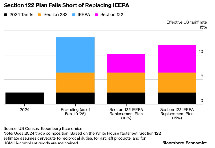 特朗普的新10%全球关税于周二生效,开启了白宫在最高法院否决其原有全面关税后维护总统贸易议程的努力。上周五在最高法院裁决出台仅数小时后特朗普签署了一项行政命令,授权征收10%的进口税。他随后威胁要将这一数字提高到15%,但截至华盛顿时间周二凌晨12点01分10%关税生效时,特朗普并未正式发布提高税率的指令。特朗普是根据1974年《贸易法》第122条征收10%基准关税的,该条款允许总统在未经国会批准的情况下征收此税150天。根据彭博经济研究的分析,包括这些豁免在内,美国平均有效关税税率将稳定在10.2%左右,低于法院裁决前的13.6%。根据该研究,在15%的全球关税下,这一有效税率约为12%。
