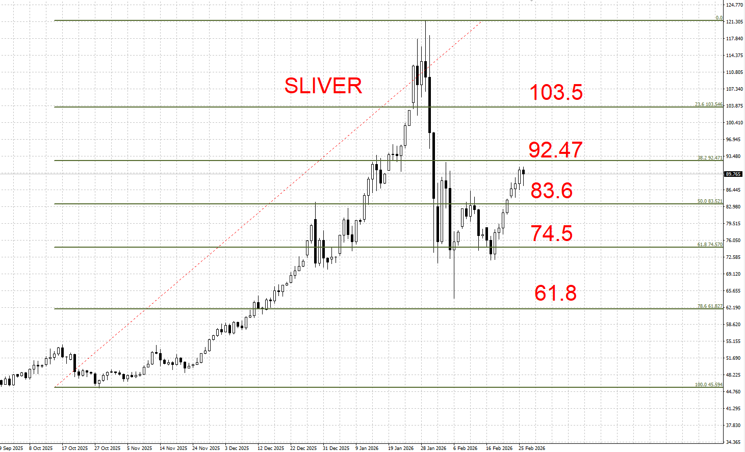 下方支撑:83.6 / 74.5 / 61.8 美元/盎司