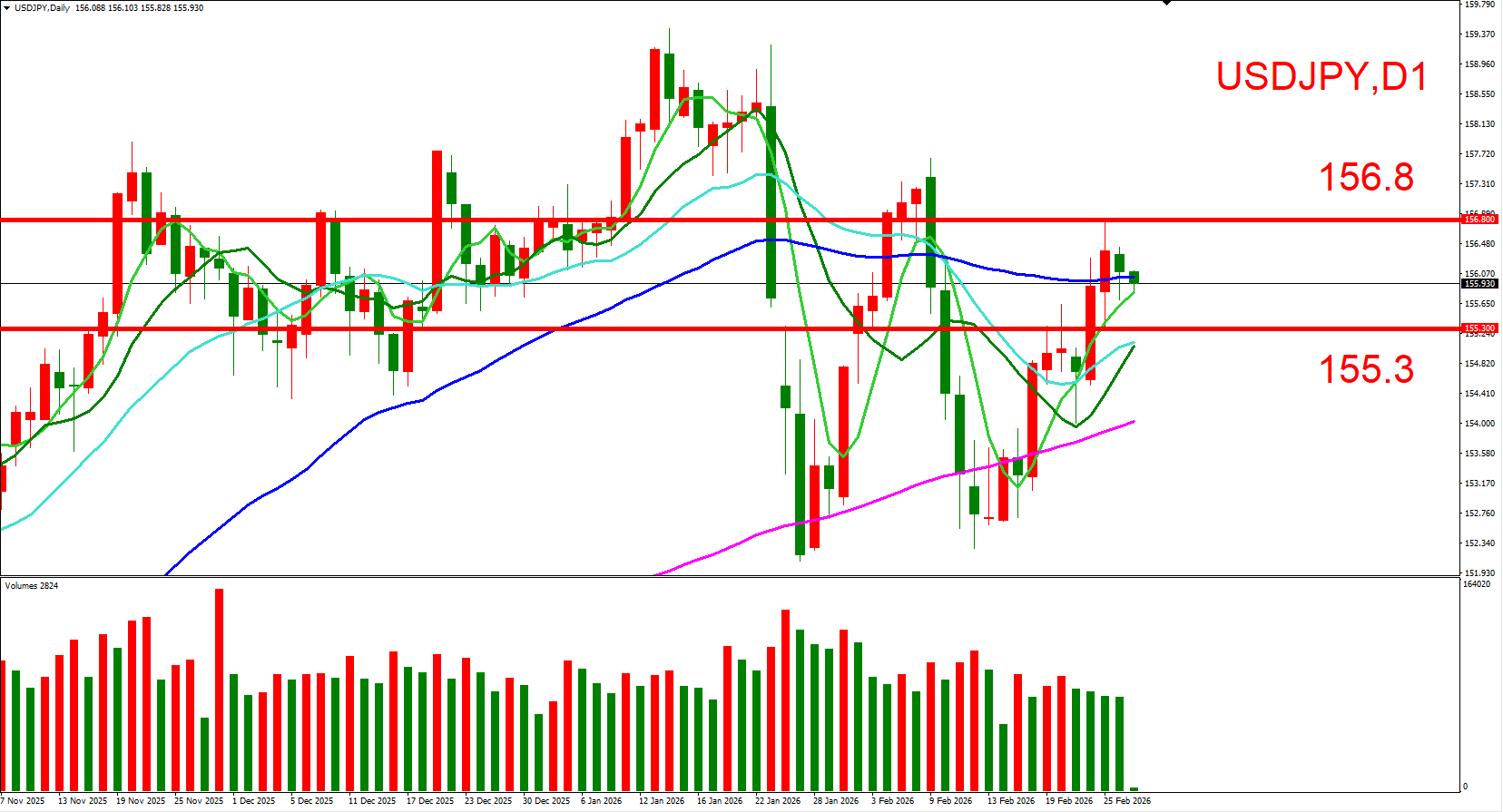 短线上可以(156.8,2/25上影线高位)与(155.3,2/25长红K上涨起点)作为压力与支撑位来做参考。
