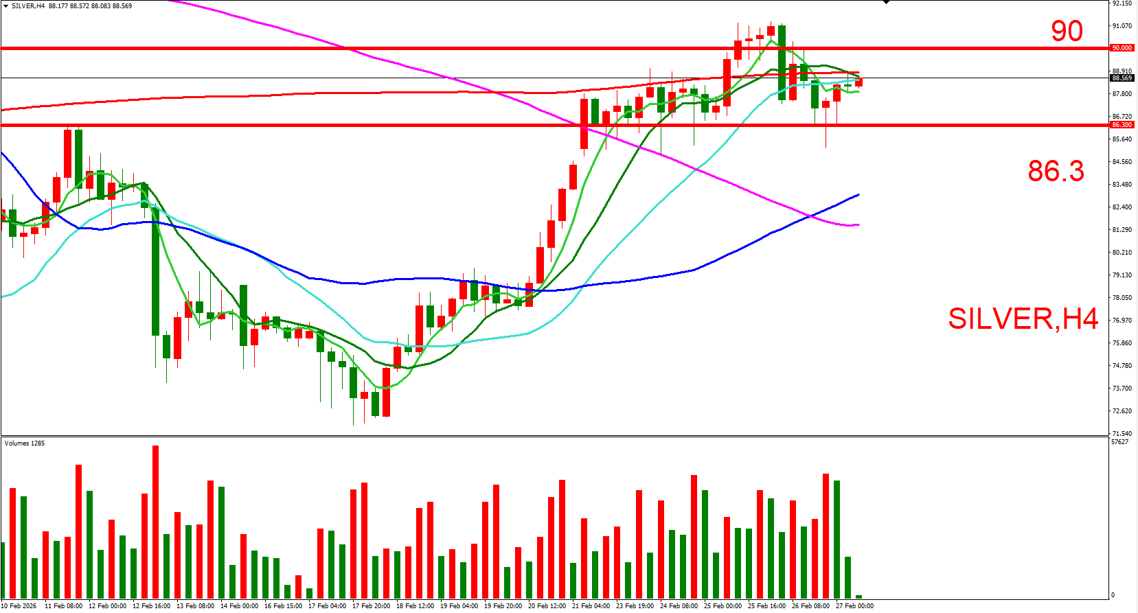 白银跟随黄金同步,短线偏多看待。可参考(90,整数大关)与(86.3,2/26大量低位),来作为压力与支撑位参考,用以判断低接或突破进场机会。