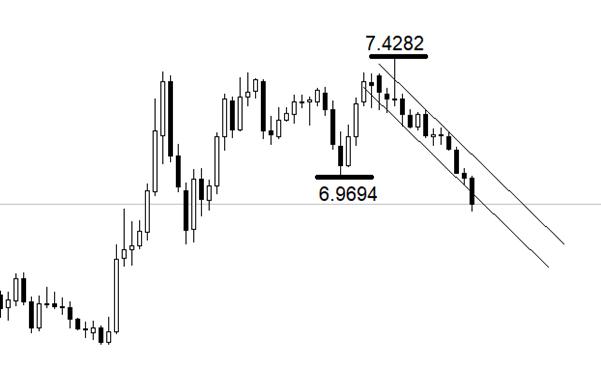 行情方面,月线级别,美元兑离岸人民币处于图中下降通道之内。月线级别的中期低点在6.9694,月线级别的中期高点在7.4282。当前的下跌波段正在寻找新的中期低点。关键支撑位6.9694已经被跌破。下方没有明显的技术性支撑,预计跌势还将延续数月。