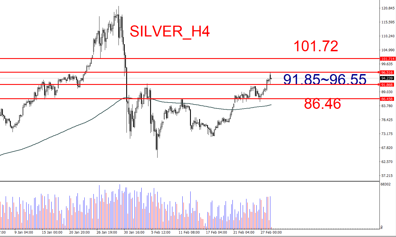 当前价格位于91.85~96.55区间,建议采取区间突破操作方式: