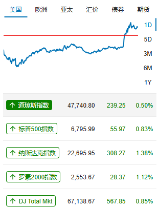 因油价开盘暴涨点燃了市场的通胀担忧,现货黄金早盘一度跌至5014.89美元的日内低点,但随后持续反弹,并收复日内大部分失地,最终收跌0.73%,报5136.61美元/盎司;现货白银在美盘时段大幅上涨,最终收涨3.12%,报86.95美元/盎司。美股三大指数集体收涨,道指收涨0.5%,标普500指数涨0.83%,纳指涨1.38%。