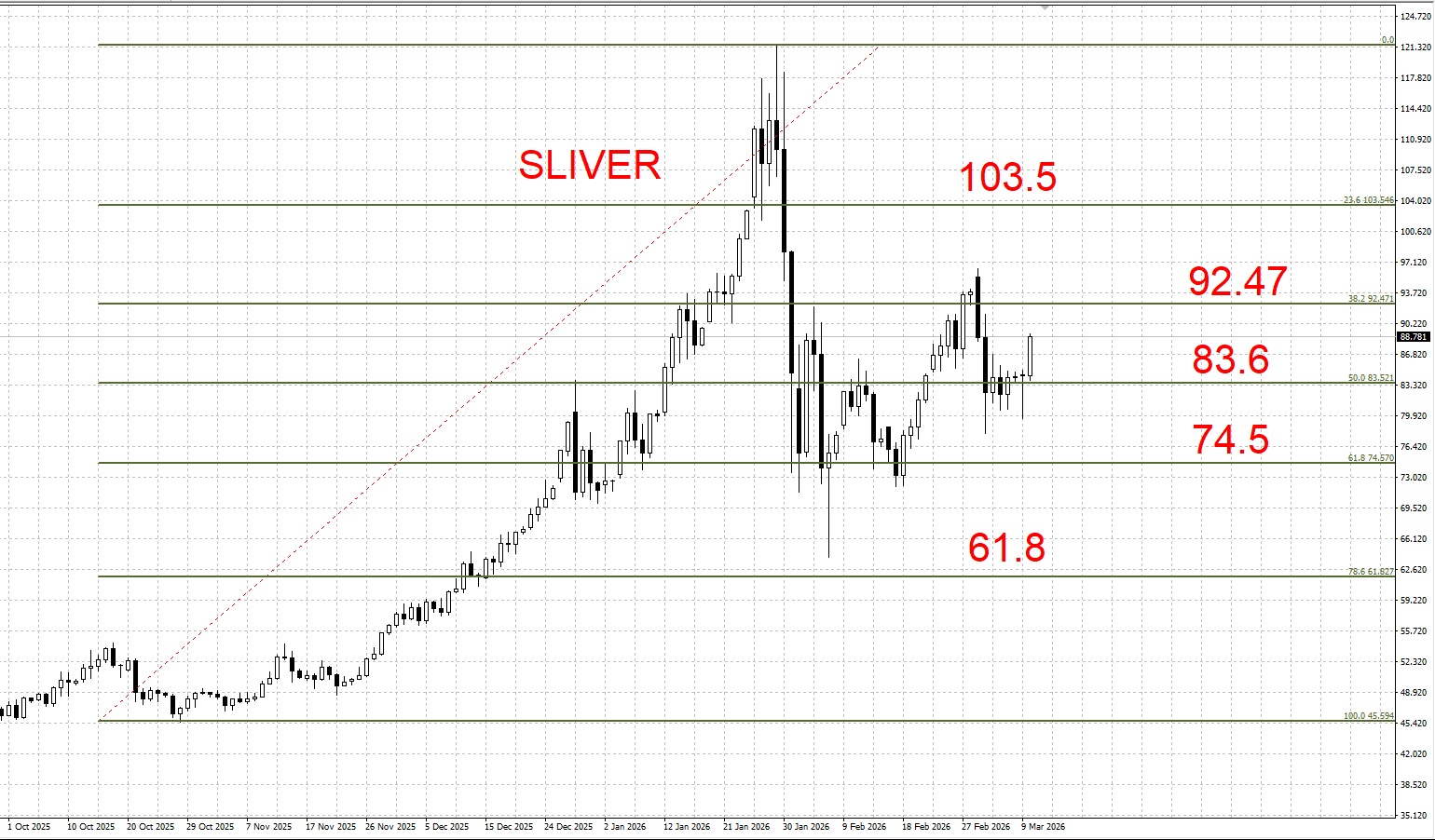 下方支撑:83.6 / 74.5 / 61.8 美元/盎司