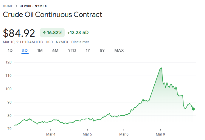 在常规交易阶段,WTI 原油在近 28 美元区间内大幅波动;布伦特原油结算价跌至每桶 99 美元下方,盘中最高曾触及 119.50 美元,从高点至收盘的跌幅创下历史纪录,凸显地缘风险下市场情绪的剧烈反转。