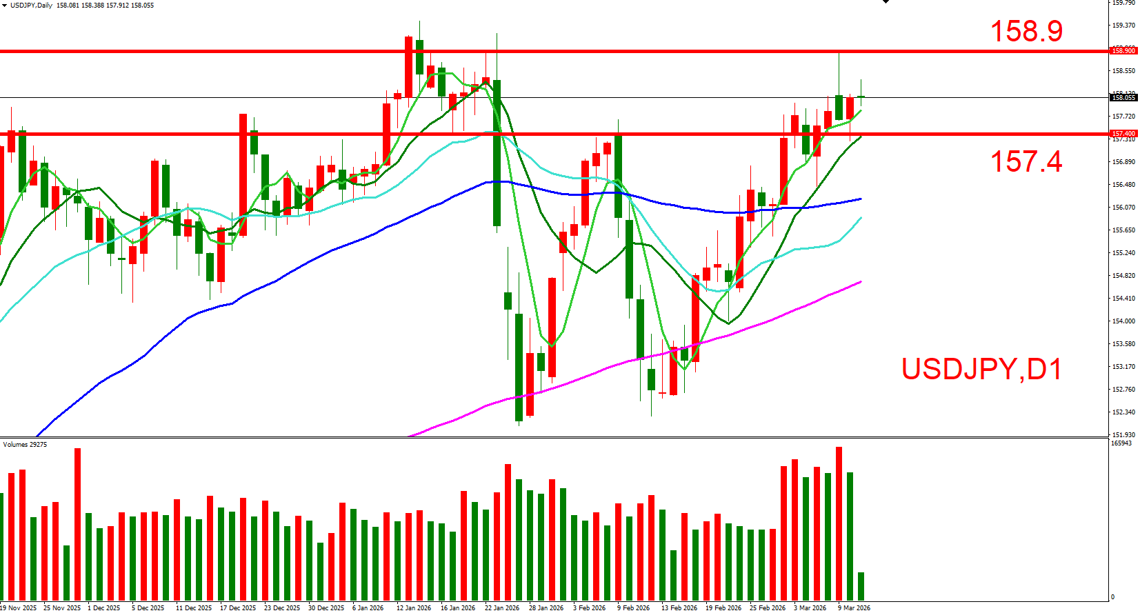 短线上可以(158.9,3/9长上影线高位)与(157.4,3/6上周低位)作为压力与支撑位来做参考。