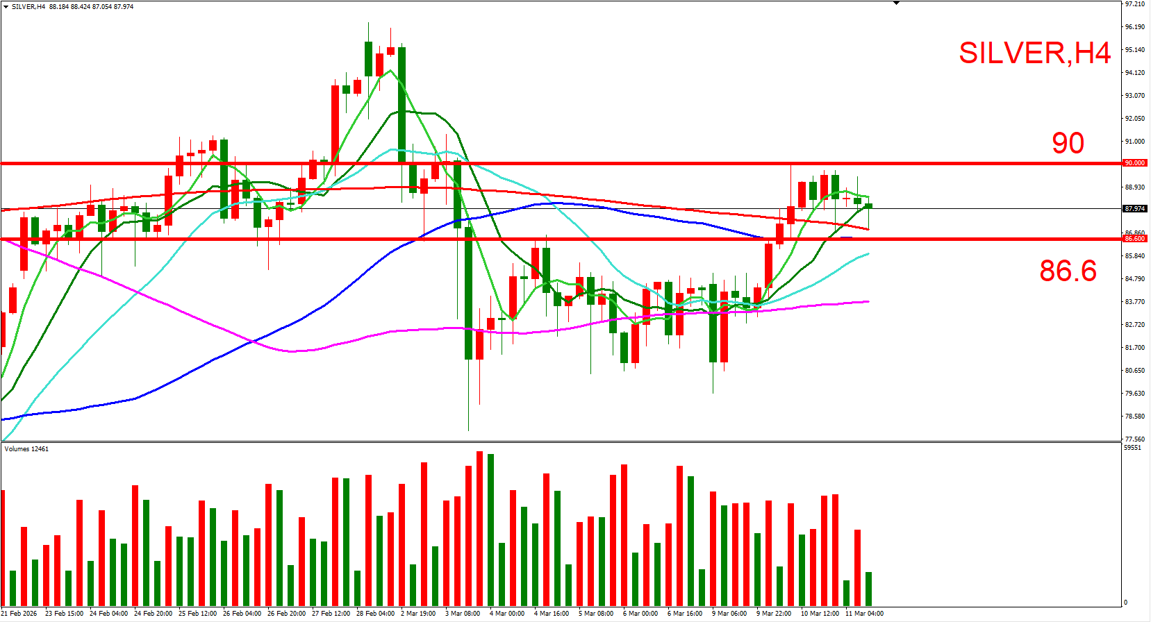 白银跟随黄金同步,短线偏多看待。可参考(90,3/10大量高位)与(86.6,3/10大量低位),来作为压力与支撑位参考,用以判断低接或突破进场机会。