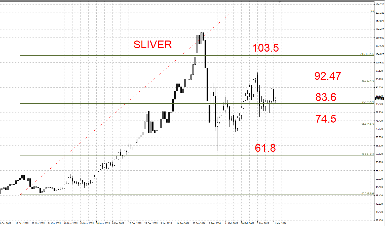 下方支撑:83.6 / 74.5 / 61.8 美元/盎司