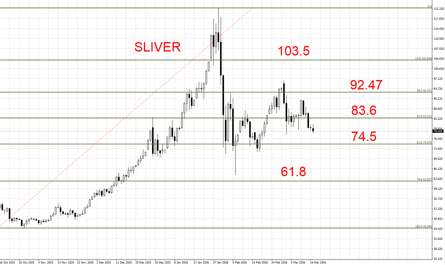 下方支撑:83.6 / 74.5 / 61.8 美元/盎司
