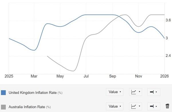 澳大利亚和英国的2月份CPI数据都会在本周三公布,并且两者大概率都将维持不变。从目前的市场预期看,澳大利亚2月份未季调CPI年率预期值为3.8%,与前值持平;英国2月份CPI年率预期值为3%,同样与前值持平。