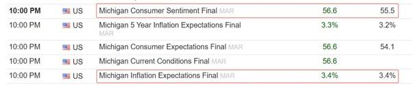 本周五22:00,将会有两项关于美国通胀率的重磅数据发布,分别是:美国3月密歇根大学消费者信心指数、美国3月一年期通胀率预期终值。两项数据的发布机构都是密歇根大学,公布的都是终值,也就是初值的调整结果。