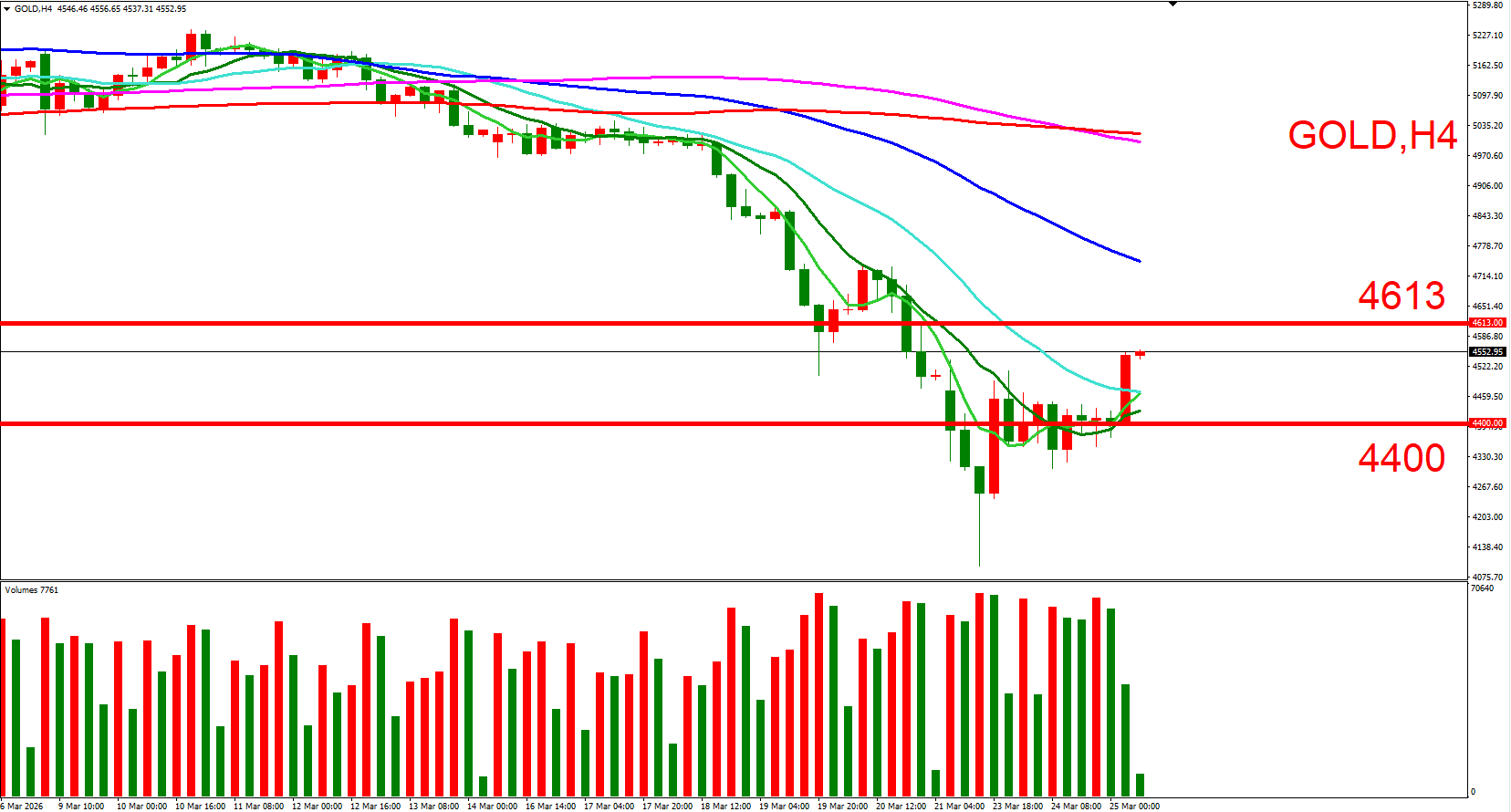 短线可以(4613,3/21前次高位)与(4400,3/23上涨起点) 来作为压力与支撑位参考,用以判断低接或突破进场机会。