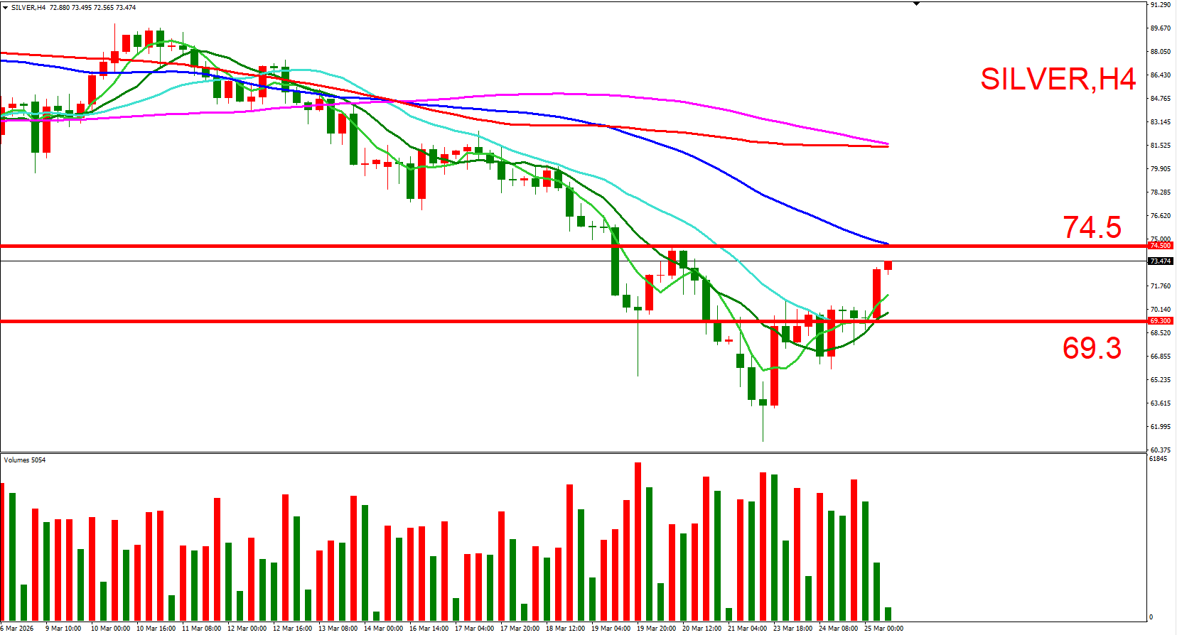 白银跟随黄金同步,日内偏多看待。可参考(74.5,3/20前次高位)与(69.3,3/23上涨起点),来作为压力与支撑位参考,用以判断低接或突破进场机会。