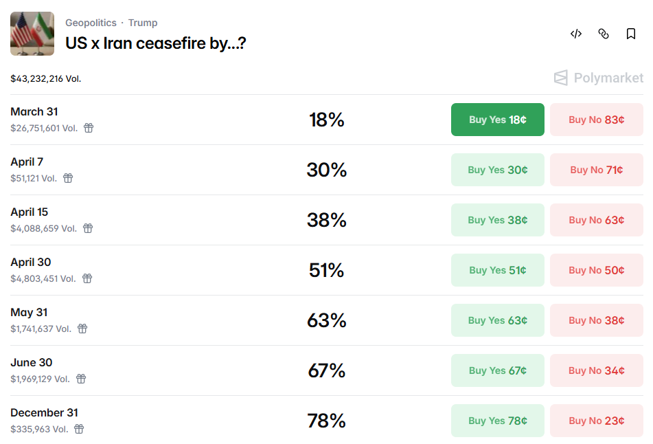 虽然持续有中间人试图调停本次战火,不过伊朗加大了在中东的攻势,对以色列、科威特、巴林和沙特阿拉伯发动了新一轮袭击。与此同时,德黑兰的官员们担心,旨在达成停火的外交努力可能是一个陷阱。据两名美国官员透露,五角大楼正计划向中东部署一支来自陆军精锐部队第82空降师的旅级战斗队,以支持针对伊朗的行动。细节方面,可以透过Polymarket对于美伊停火的预期来看,虽然本周持续有利好释出,但市场对于短期达成停火协议的信心仍不足。大多预计最快四月底之后才有可能取得协议。