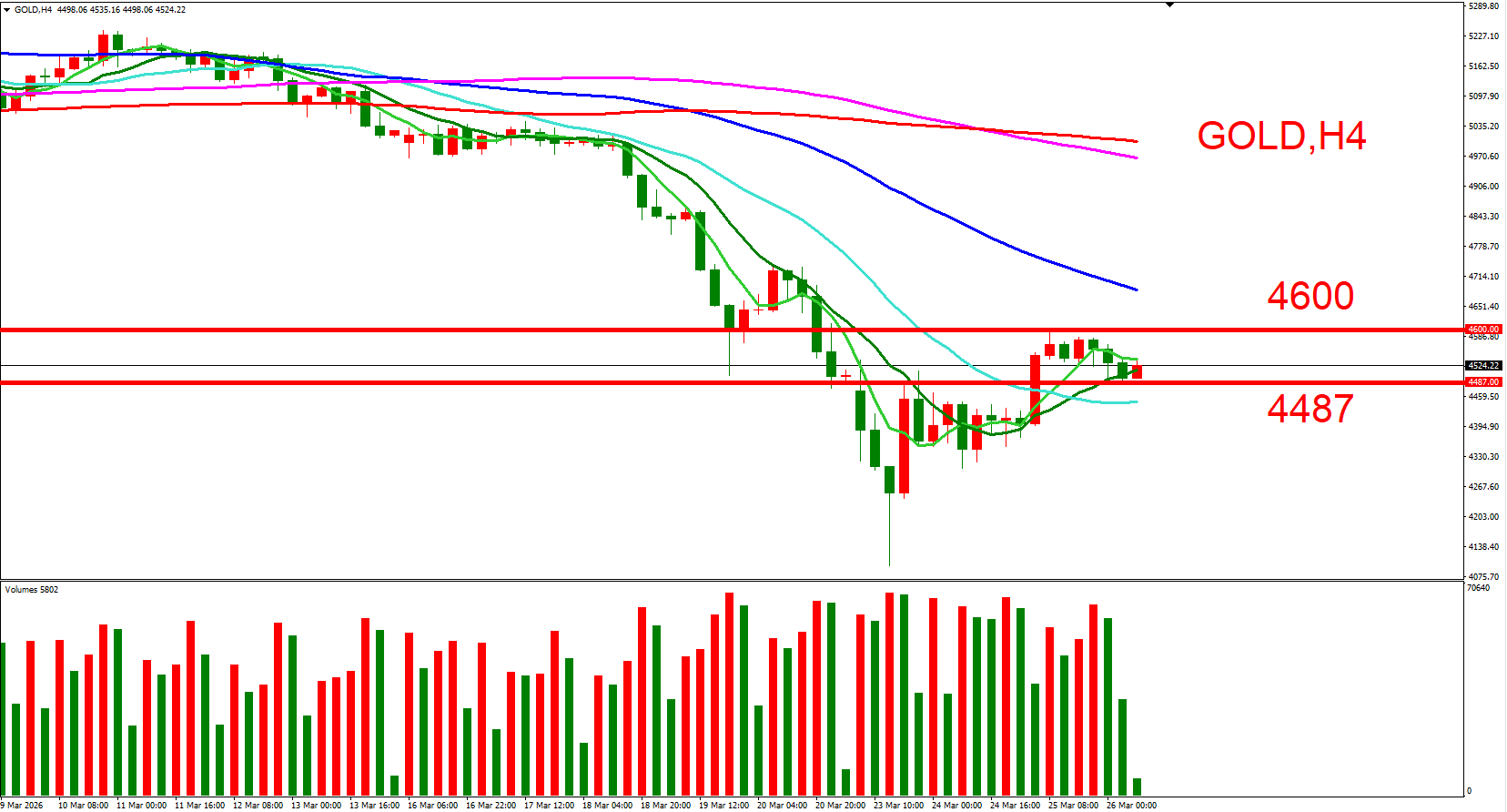 短线可以(4600,3/25横盘高位)与(4487,3/25横盘低位) 来作为压力与支撑位参考,用以判断低接或突破进场机会。