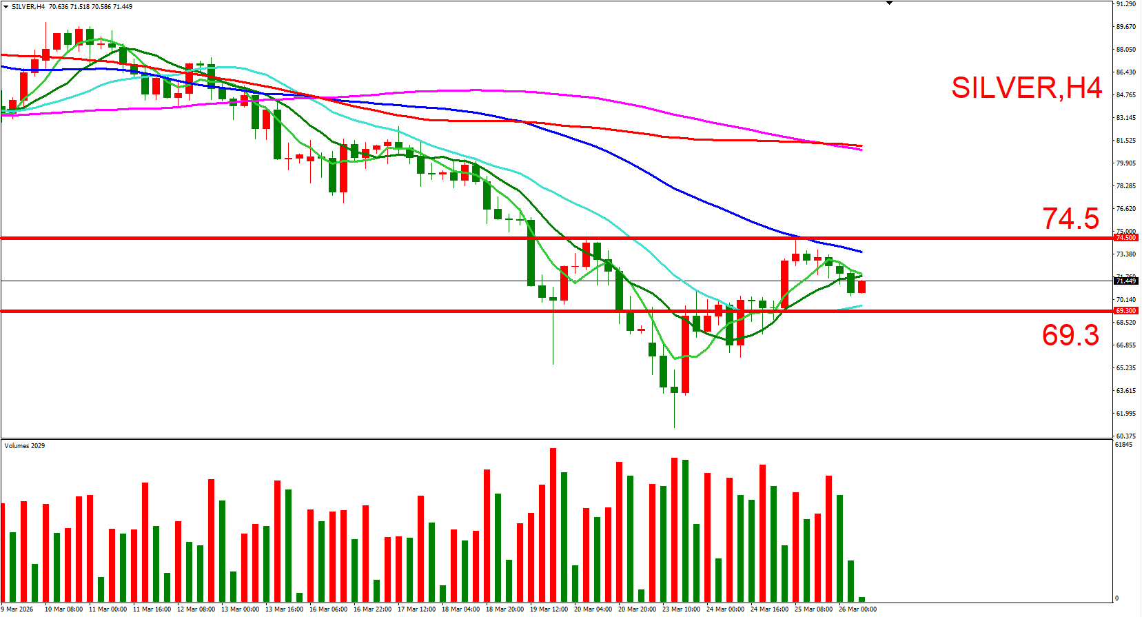 白银跟随黄金同步,日内偏空看待。可参考(74.5,3/20前次高位)与(69.3,3/23上涨起点),来作为压力与支撑位参考,用以判断低接或突破进场机会。