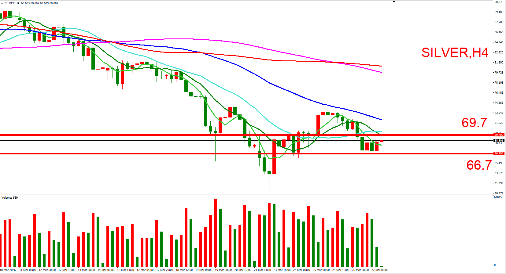 白银跟随黄金同步,日内偏空看待。可参考(69.7,3/26大量高位)与(66.7,3/26大量低位),来作为压力与支撑位参考,用以判断低接或突破进场机会。