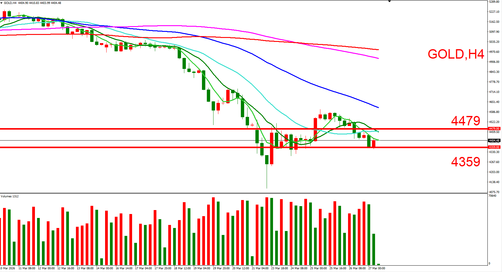 短线可以(4479,3/26大量高位)与(4359,3/26大量低位) 来作为压力与支撑位参考,用以判断低接或突破进场机会。