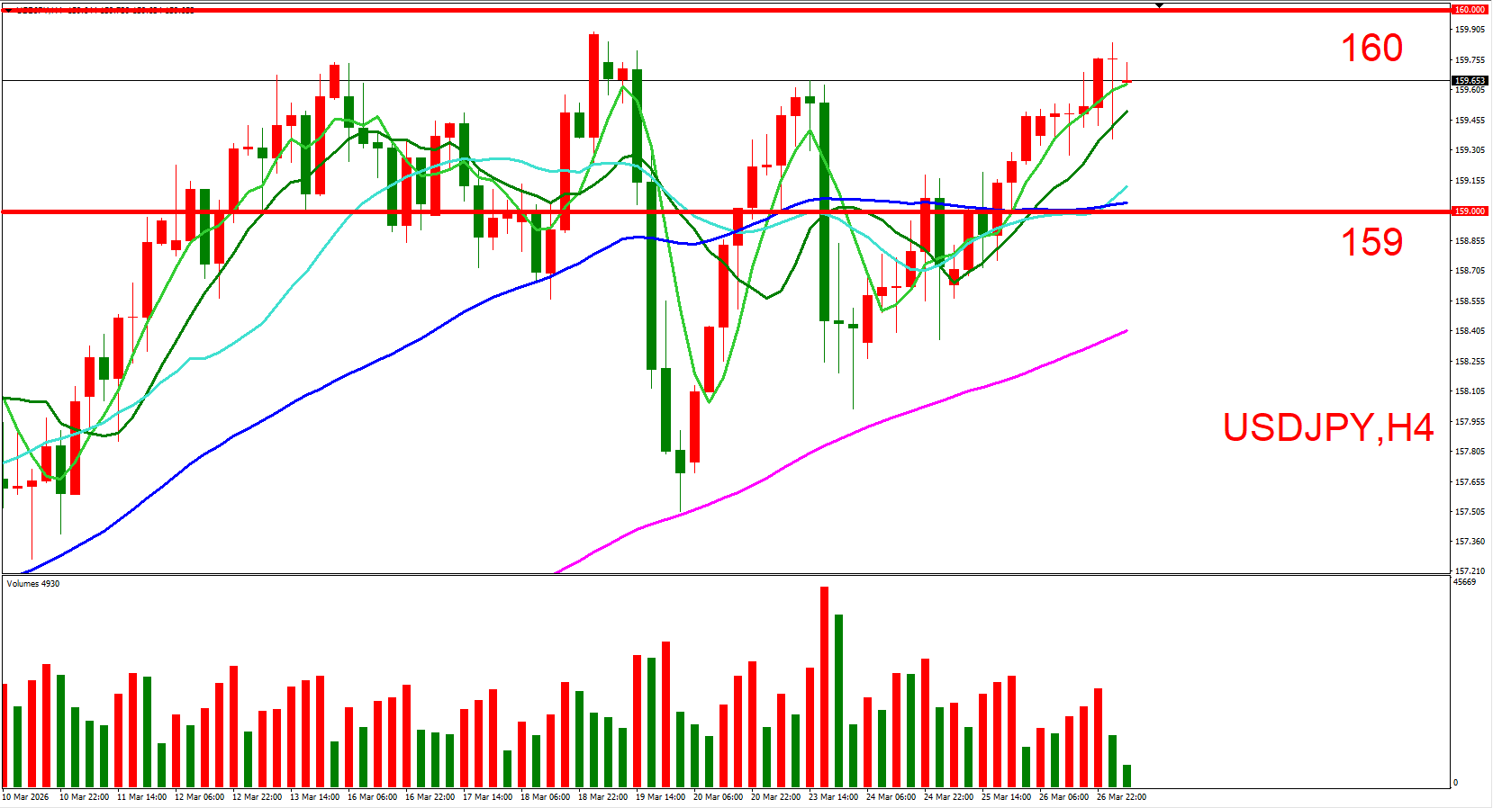 短线上可以(160,日本央行心理防线)与(159,H4的20/50均线支撑)作为压力与支撑位来做参考。
