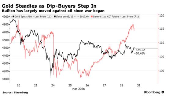 ATFX:随着伊朗战争进入第五周,周一亚市黄金价格略微高开后一度走低,随后在4500美元上方持稳。上周,自中东冲突爆发以来,黄金首次实现周线上涨,在经历了多年来最大规模的抛售之后,一些逢低买盘支撑了金价,市场也在等待冲突持续时间的明朗情况。