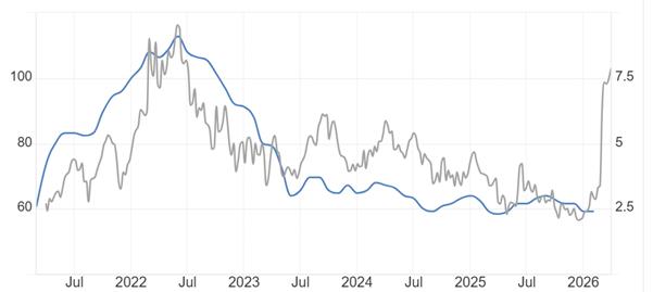 ATFX:能源价格是影响美国通胀率的重要因素,上图是美国最近5年CPI数据走势图与WTI价格的叠加,显而易见,两者存在极强的共振性。2022年5月份,WTI创出新高,6月份CPI数据就同步新高;2025年12月,WTI触及阶段性低点,隔月,CPI数据也创出阶段性低点。