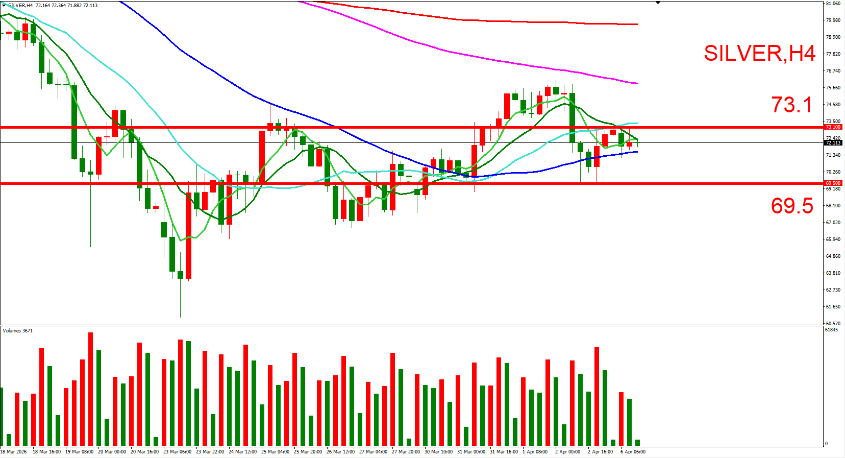 白银跟随黄金同步,日内观望看待。可参考(73.1,4/03大量高位)与(69.5,4/03大量低位),来作为压力与支撑位参考,用以判断低接或突破进场机会。