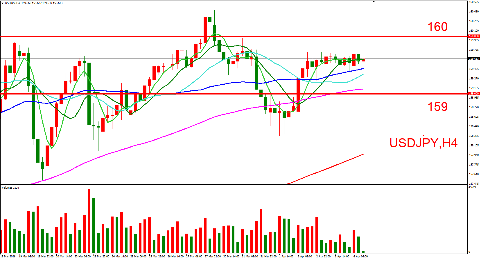 短线上可以(160,日本央行心理防线)与(159,H4的20/50均线支撑)作为压力与支撑位来做参考。