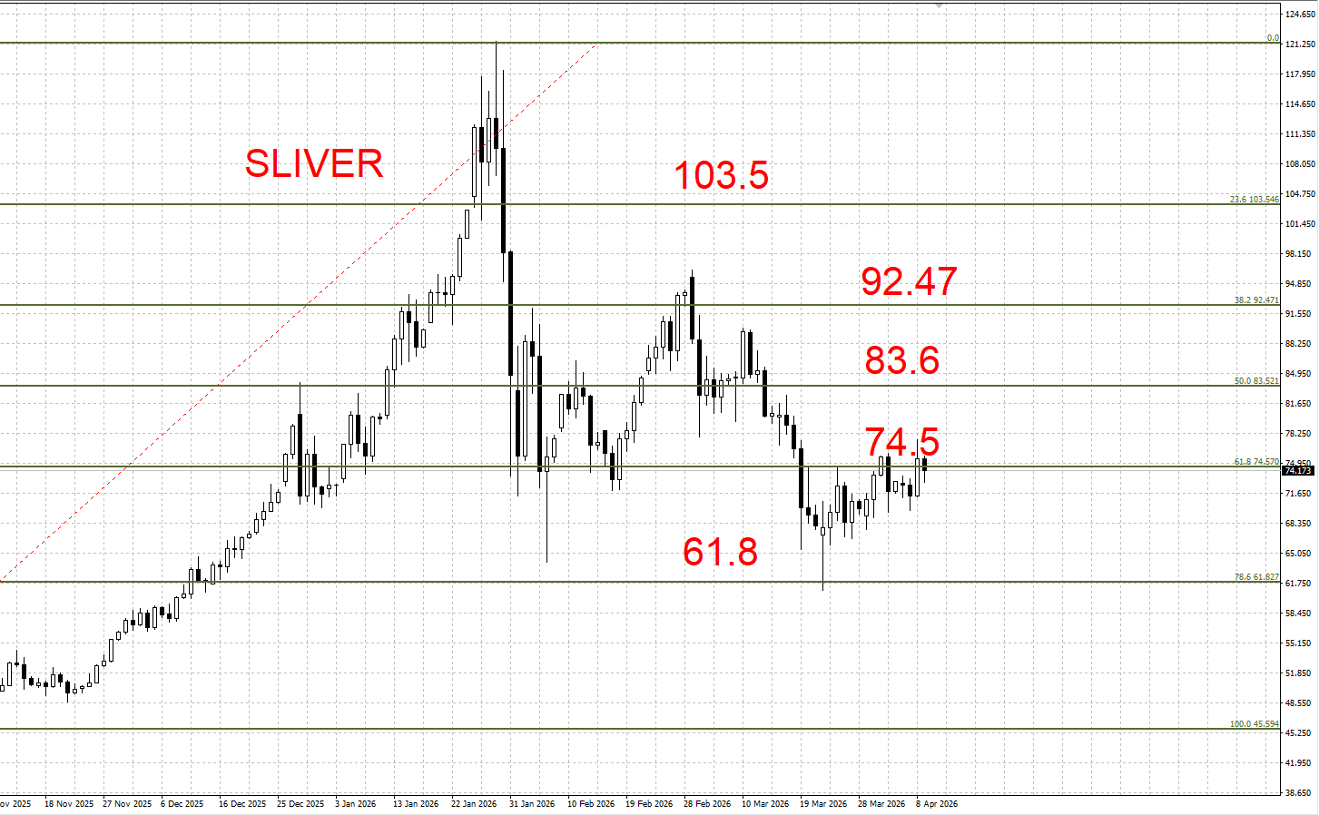 下方支撑:74.5 / 61.8 美元/盎司