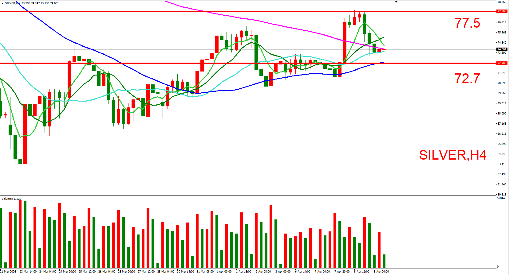 白银跟随黄金同步,日内偏多看待。可参考(77.5,4/08高位)与(72.7,4/08上涨起点),来作为压力与支撑位参考,用以判断低接或突破进场机会。