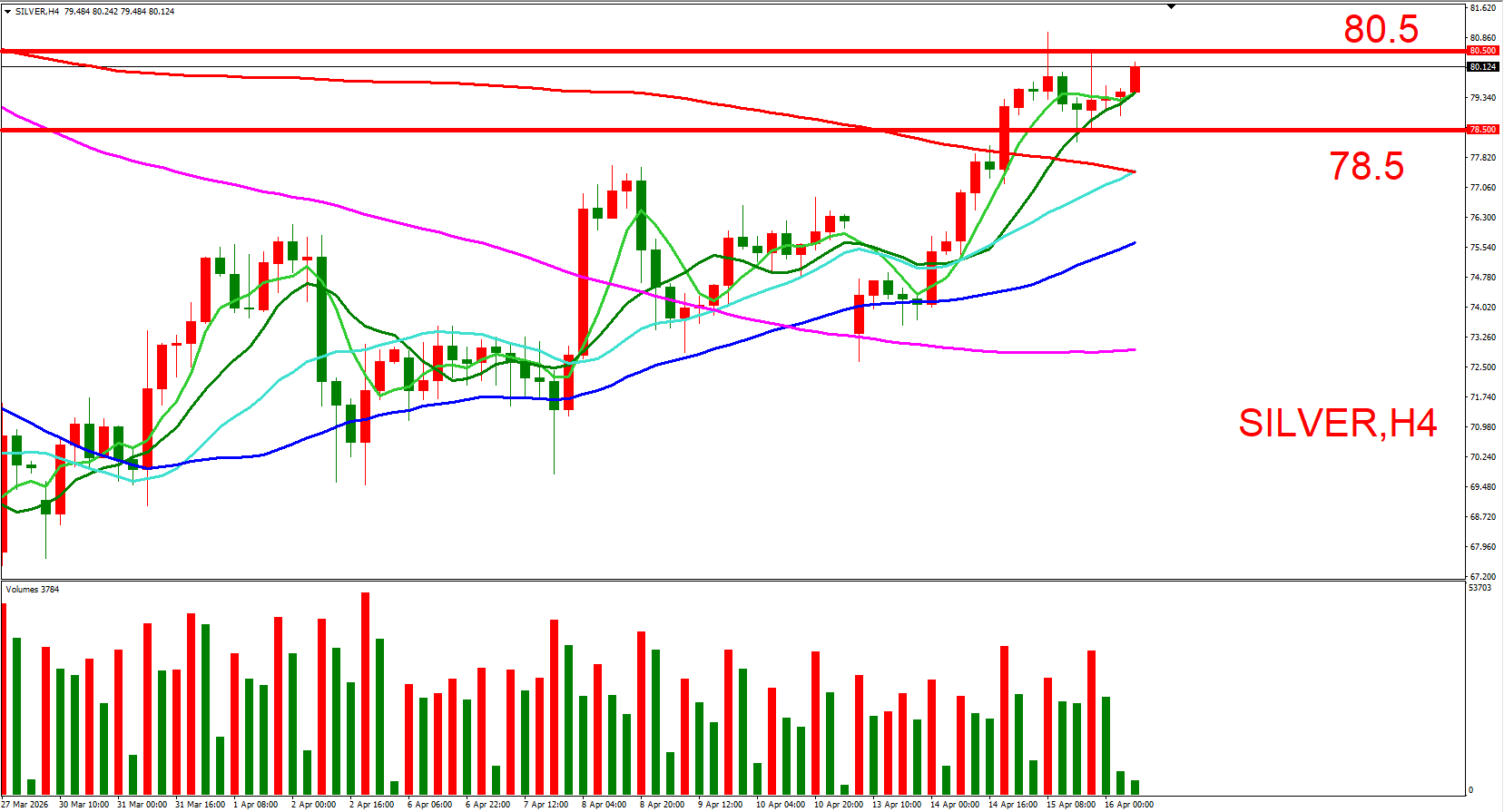 白银跟随黄金同步,日内偏多看待。可参考(80.5,4/15大量高位)与(78.5,4/15大量低位),来作为压力与支撑位参考,用以判断低接或突破进场机会。