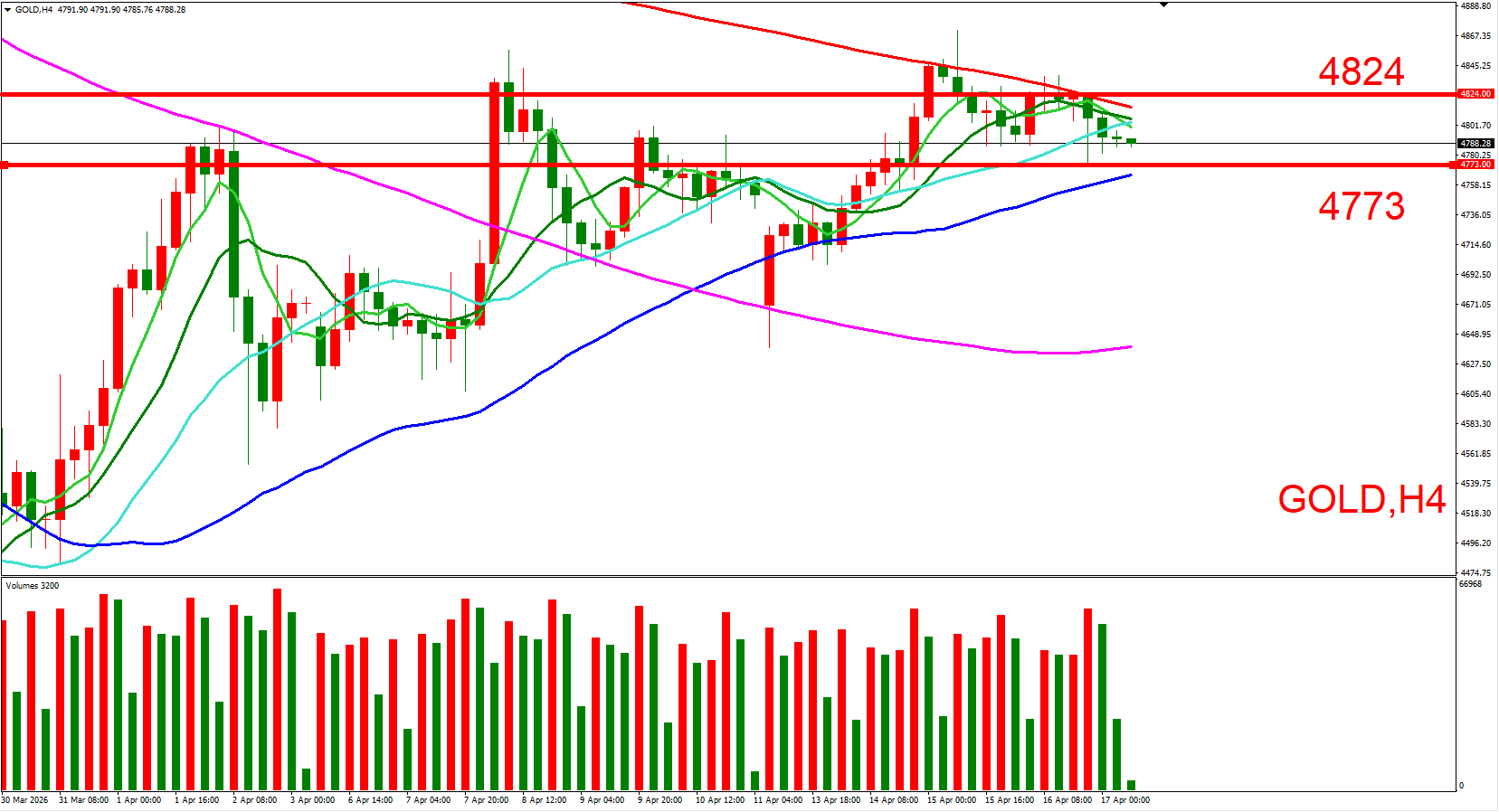 短线可以(4824,4/17大量低位)与(4773,4/17大量低位) 来作为压力与支撑位参考,用以判断低接或突破进场机会。