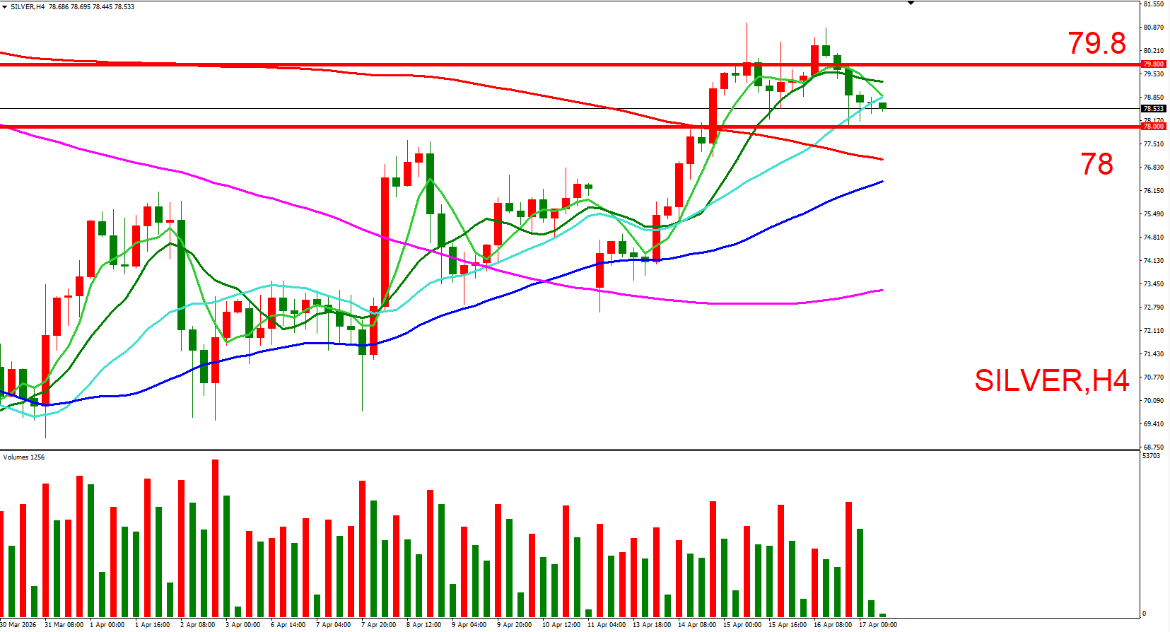 白银跟随黄金同步,日内偏多看待。可参考(80.5,4/16大量高位)与(78.5,4/16大量低位),来作为压力与支撑位参考,用以判断低接或突破进场机会。