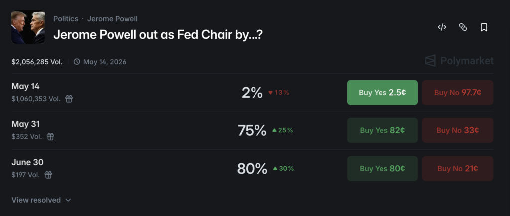 美联储主席鲍威尔任期将在今年5月15日届满,不过当前新任联储主席沃什的提名案仍卡关,若未能顺利于国会通过,美联储主席鲍威尔可能将会暂代临时主席一位。而根据预测网站Polymarket数据来看,押注美联储主席鲍威尔于5月31日前下台的概率为75%,也就意味着有25%的可能性鲍威尔会因提名案卡关而担任临时主席。