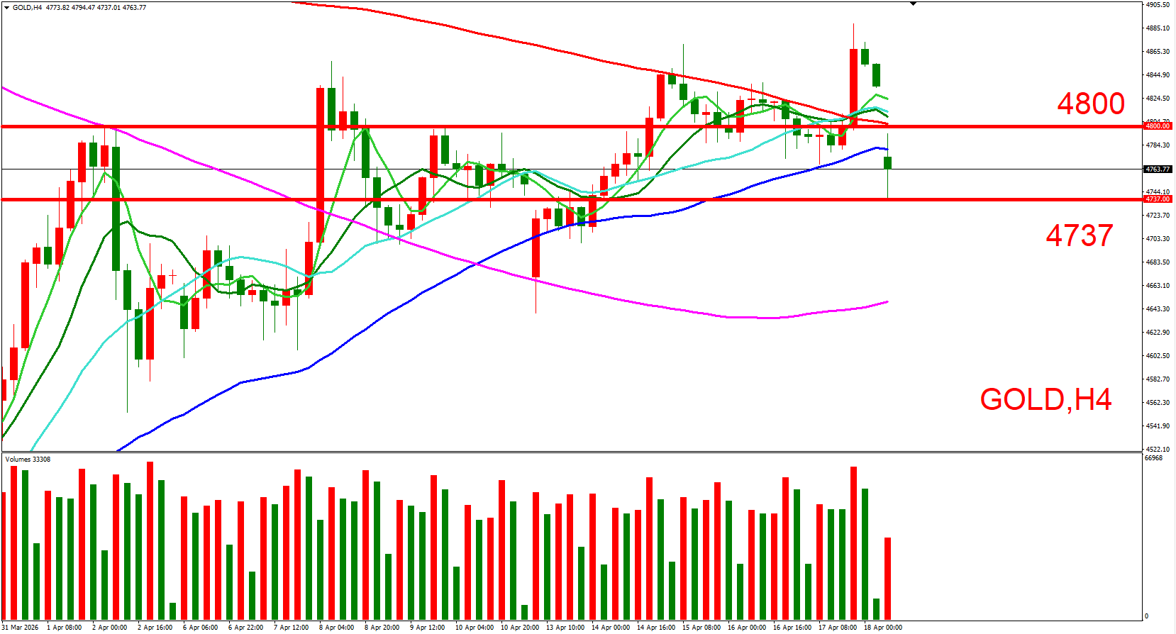 短线可以(4800,整数大关)与(4737,4/20跳空低位) 来作为压力与支撑位参考,用以判断低接或突破进场机会。