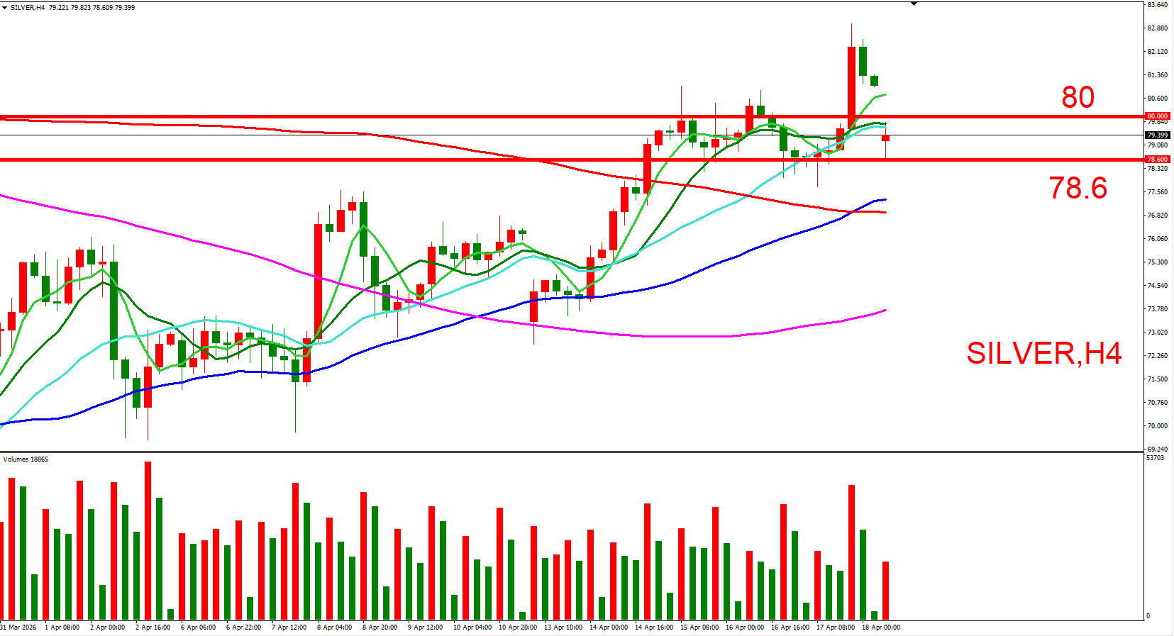白银跟随黄金同步,日内偏空看待。可参考(80,整数大关)与(78.6,4/20跳空低位),来作为压力与支撑位参考,用以判断低接或突破进场机会。