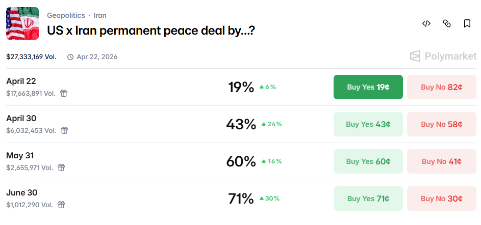 美国副总统万斯原计划前往巴基斯坦,与伊朗重启谈判,但德黑兰方面拒绝派代表出席,理由是美方提出了他们所谓的不合理要求。伊朗半官方的塔斯尼姆通讯社报道称,目前伊朗参与谈判的前景渺茫。根据预测网站Polymarket对于美国和伊朗取得和平协议的预估,仅有19%的概率美伊有望在本次会谈上达成协议,目前市场大多认为美伊至少会在五月后才有机会取得和平协议。