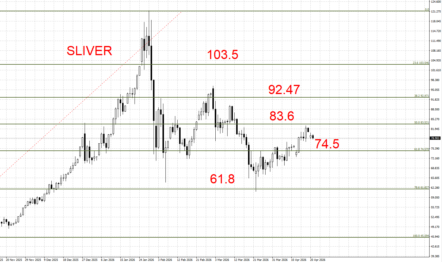 下方支撑:74.5 / 61.8 美元/盎司