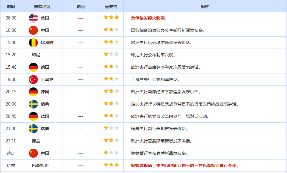 美元指数周二上涨0.36%报98.43,升至一周高点,因美伊停火前景不确定性加剧,投资者担忧霍尔木兹海峡航运中断可能持续。在停火期限仅剩一天之际,美军在海上登上一艘伊朗油轮,伊方随后表示尚未决定是否参加和平谈判;同时白宫官员称美国副总统万斯尚未启程前往巴基斯坦,此前关于其行程的矛盾消息令市场动荡。