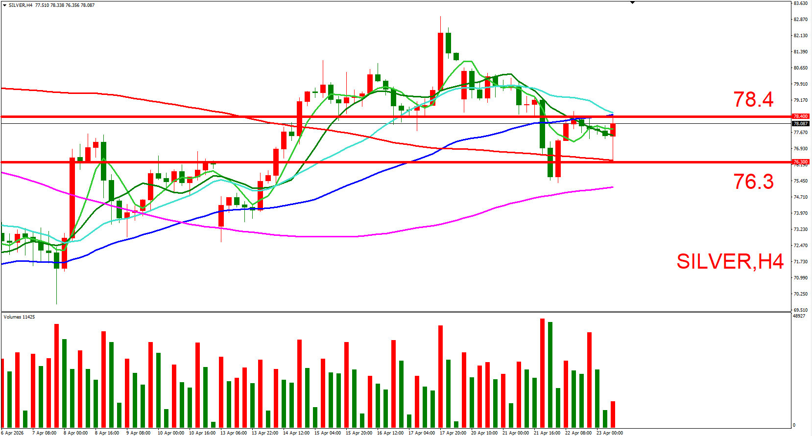 白银跟随黄金同步,日内偏多看待。可参考(78.4,4/22大量高位)与(76.3,今日下影线低位),来作为压力与支撑位参考,用以判断低接或突破进场机会。