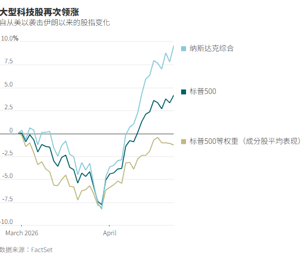 近期以来AI科技巨头再度拉动美国三大股指持续走高,纳斯达克指数、费半纷纷创下历史新高,虽然当前市场依旧深陷地缘情势的阴霾中,但似乎也无法阻挡科技股持续上涨。标普指数成分股中,有118只股票跌幅超过10%。这些企业要么正面临燃料、铝及其他原材料成本上涨的压力,涨幅超过10%的股票仅有82只,且大多与AI相关,主要七大科技巨头正持续托举整个市场。超过一半的标普成分股都在下跌,导致美国普通股票的跌幅几乎与剔除美国本土市场的MSCI明晟全球指数跌幅相当。然而,美国大盘指数却上涨了4%,科技股密集的纳斯达克指数更是大涨8%。原因无他:头部股票的体量极其庞大,足以抵消其他股票下跌的拖累。